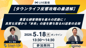 本講演では、この「タウンライフ反響の攻略術」を徹底解説します。入手した顧客のこだわり情報をAIが深掘りし、自社の強みやイベントに自動で紐づけることで、他社より早く優位な位置を獲得する『ポールポジション戦略』をお伝えします 。顧客の心を動かし、お会いする前に「御社が本命」という深い信頼を育てられるDigimaの圧倒的な追客ノウハウをぜひご覧ください 。